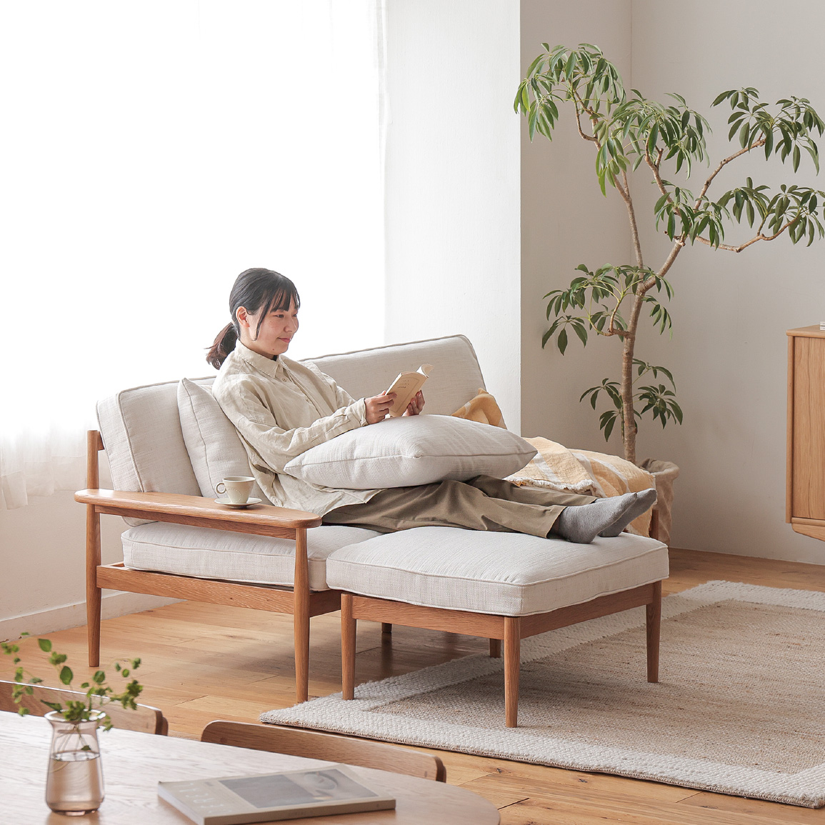 Couch sofaコンパクトだけど豊かな居心地が魅力。それぞれの場所でゆったりと過ごせるカウチソファーです。2人暮らしや、ご夫婦と小さなお子様のような家族構成のご家庭におすすめなサイズ感で、十分に広い座り心地。さらに、脚を伸ばして座れるので、カウチならではのリラックス感も楽しめます。