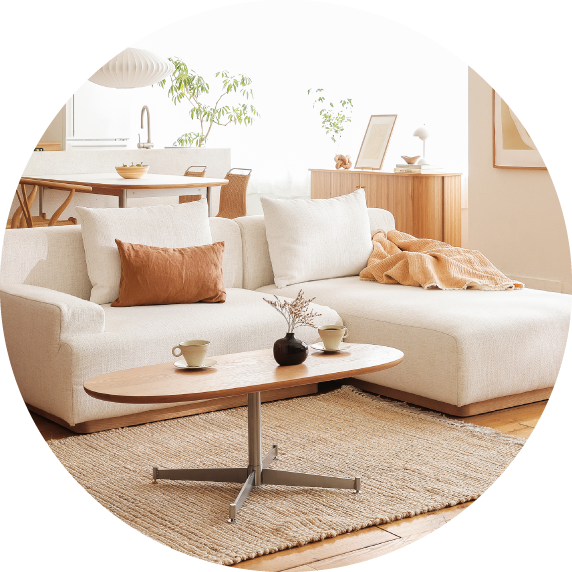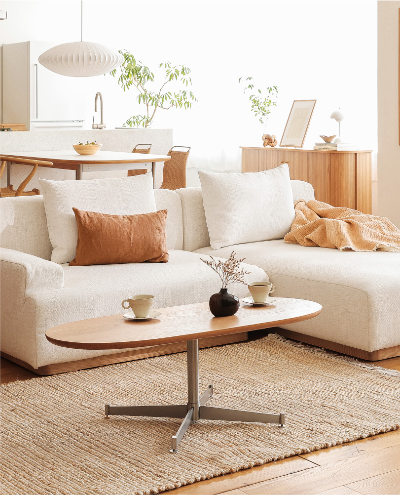 「今のレイアウトにちょっと飽きたな...」というときは、ソファーの間にサイドテーブルを置けば、それぞれのパーソナルスペースを確保した新鮮なレイアウトに。