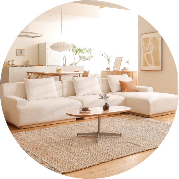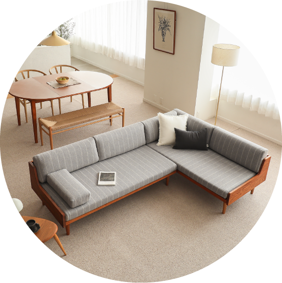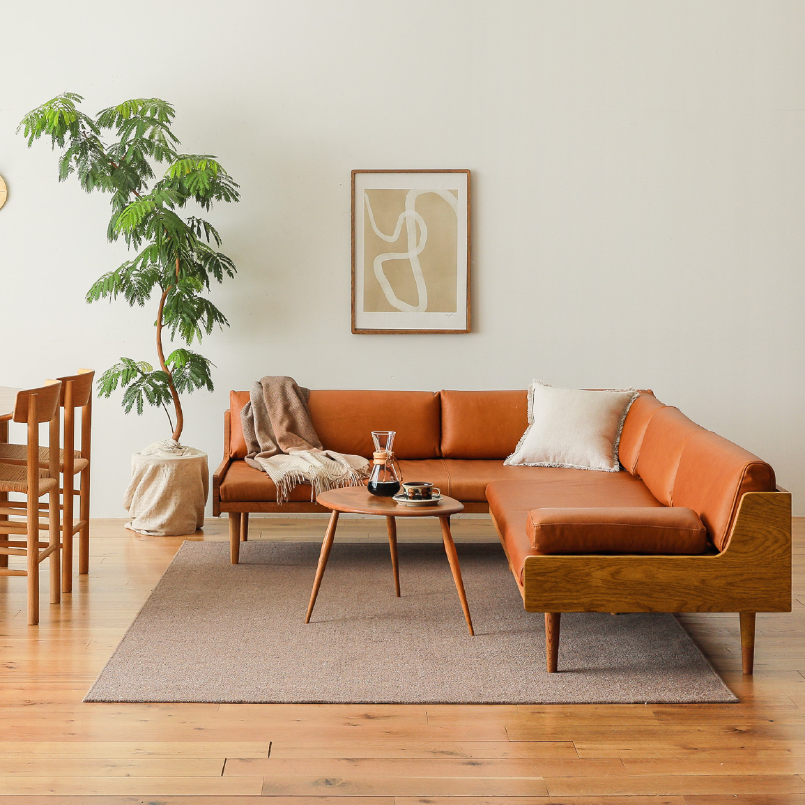 Corner sofa間取りに合わせて「1.5人掛け+コーナー+3人掛け」のような片側に伸びたL字ソファーとしても、贅沢な座り心地を実現できます。カウチソファーのように脚を伸ばして座る場所が出来ますので、みんなで映画を見るのにも快適に過ごせるでしょう。