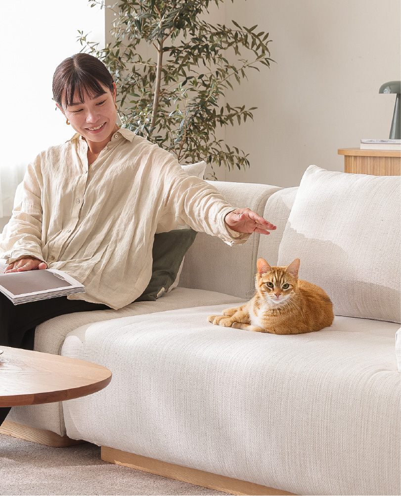 ペットにも安心して使っていただける様、「2000回」のスナッグ試験をクリアする生地を開発。犬や猫の爪が引っかかりにくく、ペットと暮らすご家族も安心です。