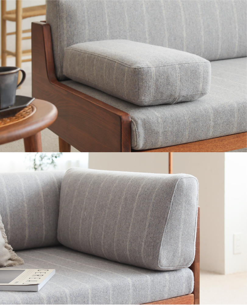 ユニットソファーとしては唯一、木製アームを使用。ヴィンテージ家具にもよくあるオーク無垢材で作られており、使っていくうちに、愛着の湧く1台に変化していきます。