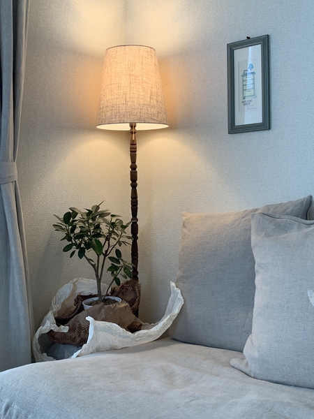定番の使い方として、ソファーの横に配置しました。のんびり自宅で映画を見ながら、ムードのある空間を楽しむ事ができます。