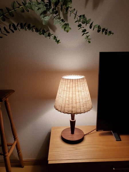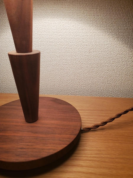 夜に見る奥行きのある表情とは打って変わり、綿麻でできたシェードの素朴さや、ウォールナットから感じられる木本来の温もりがはっきりと表れます。