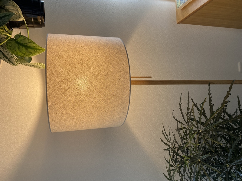 リセノオリジナルの「フロアライト Oak&LinenMix(オーク&リネンミックス)」は、コットンリネン生地のシェードと、オーク無垢材のスタンドを合わせたシンプルなデザイン。