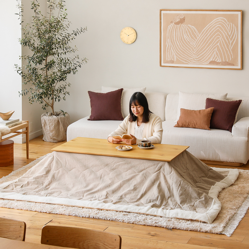 1年中使えるこたつテーブルとして、シンプルで美しい佇まいに拘った「FAM-NATURAL(ファムナチュラル)」。小さめのリビングや、1人暮らしの方におすすめな、幅 105cmタイプです。