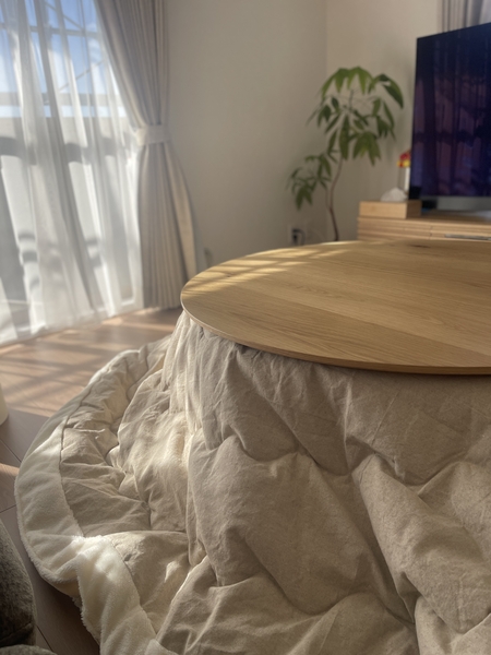 また角がない分、同じサイズのこたつテーブルに比べて周辺が歩きやすいというポイントも。大きさの割に動線を邪魔しないので意外と取り入れやすいです。