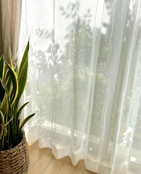 日差しが当たる窓際での様子。透け感があるので、お部屋にキラキラと木漏れ日のような光が入ってきます。光を通すことでリネンの生地感が強調され、柔らかく優しい雰囲気に。