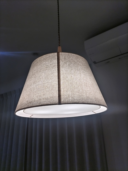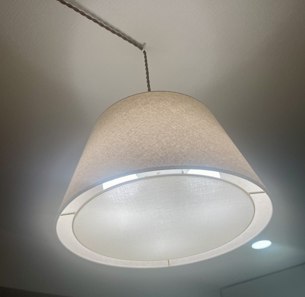 とてもベーシックな形状で、トラディショナルともいえる今回のペンダントライトですが、素敵な生地を採用できたことで、柔らかな光を与えてくれました。