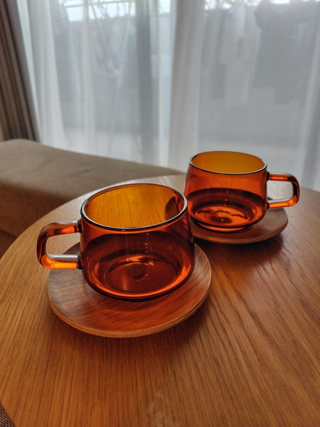 深みのある琥珀色と、横広めのぽってりとしたデザインが特徴のカップ&ソーサー「SEPIA(セピア)」。