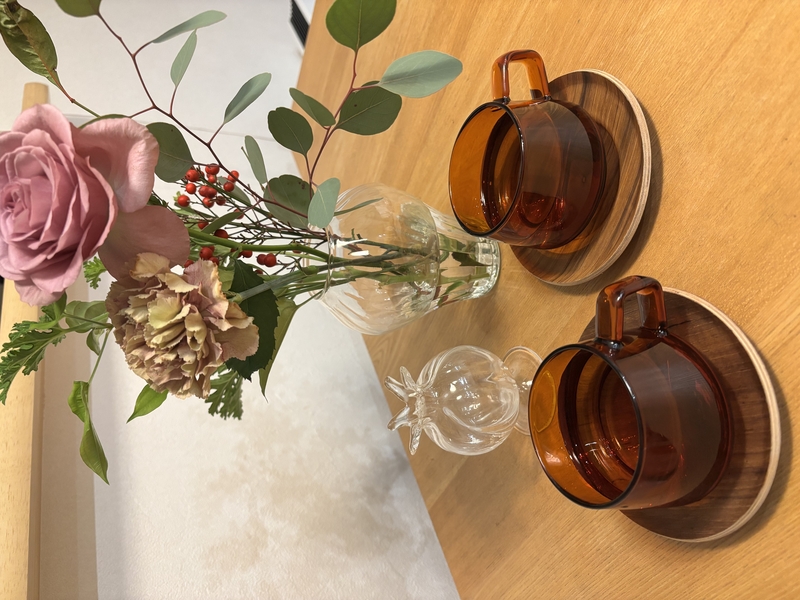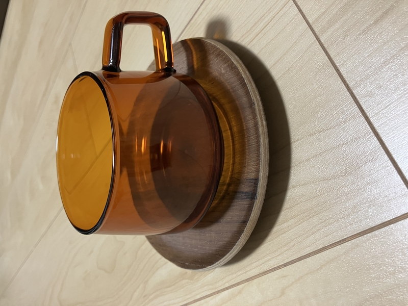 ガラス素材なのに琥珀色のほっこりさせてくれるカップ,そして自然素材のソーサーとても素敵です