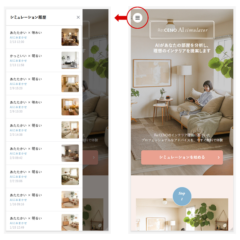 AIシミュレーターにて「シミュレーション履歴」が見られるようになりました。 AIシミュレーターにて「シミュレーション履歴」が見られるようになりました。 左上のメニューボタンをクリックいただくと、これまでにシミュレーションした履歴が表示されます。