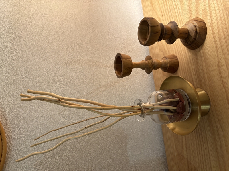 例えば、こちらの画像。左は「ウッド」「陶器」「真鍮」といった、バラバラの要素を持つアイテムを組み合わせました。規則性がなく、チグハグな印象ですね。右はすべて「真鍮」の組み合わせ。やや単調となってしまっております。