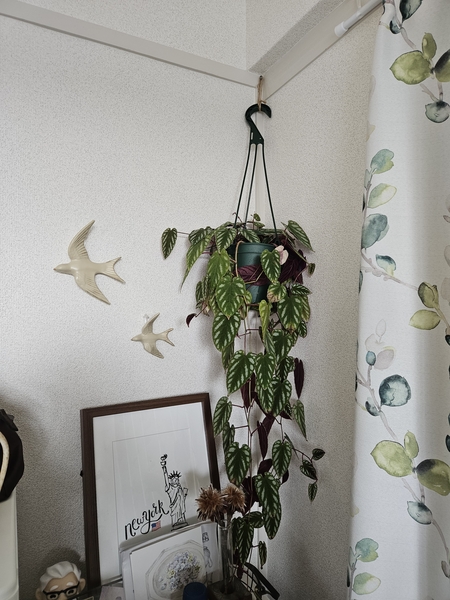 画像では、ドアの横の余ったスペースに、植物と合わせて飾ってみました。自然の風景で想像される通り、鳥モチーフと植物は相性抜群。