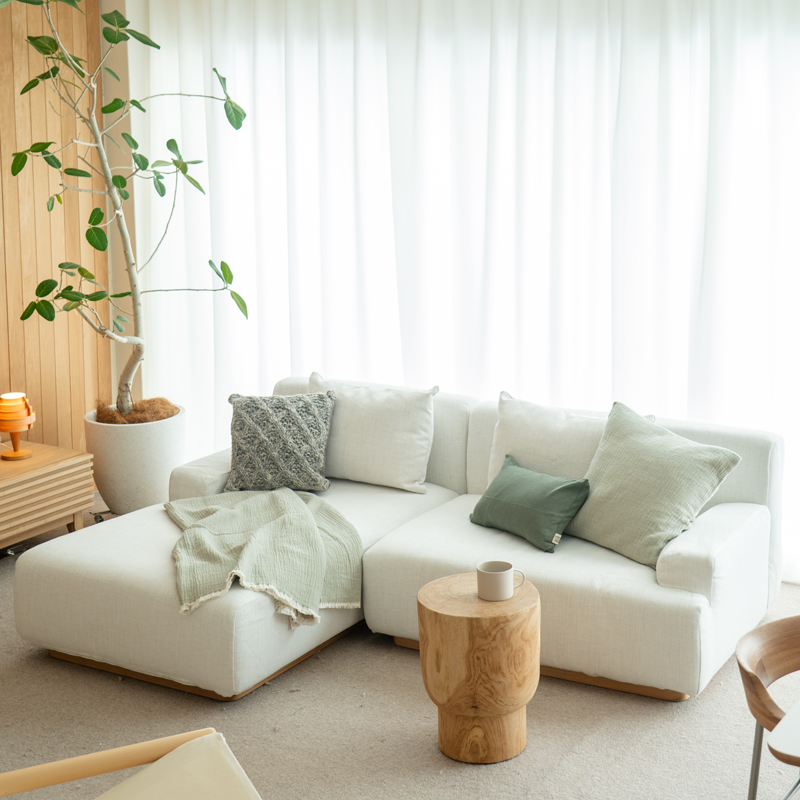 ソファー自体がシンプルのため、色あざやかなクッションやブランケットなどのアイテムを合わせていただくと、色味を美しく引き立ててくれます。