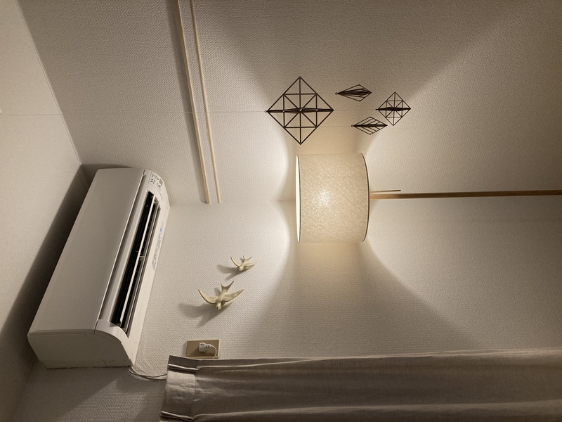 押しピンで設置できて、エアコンから近い位置においても、風の流れでゆっくりとした動きが出るため、空間を埋めるためにモビールを設置して正解でした!