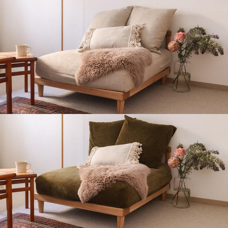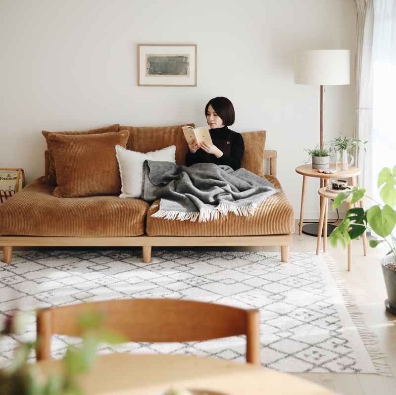 愛用中の1.5人掛けソファー「AGRA」。コーデュロイカバーに替えて、心地いい冬の住処が完成しました。