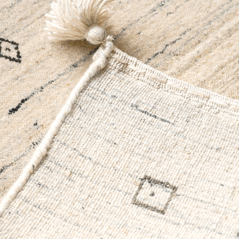 さらに、ラグマットの四隅にあしらわれたフリンジとサイドの織り模様がなんとも目をひくデザイン。