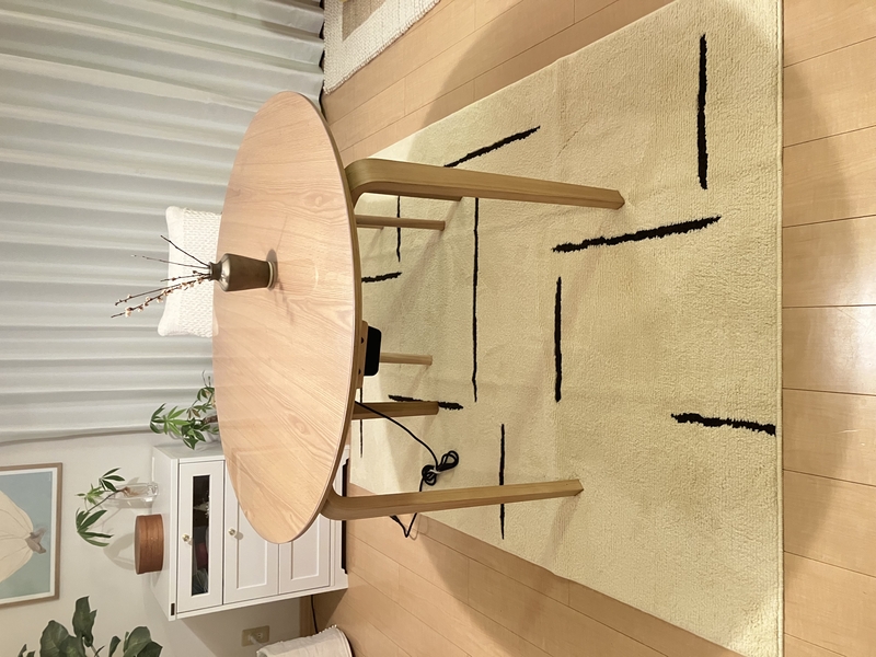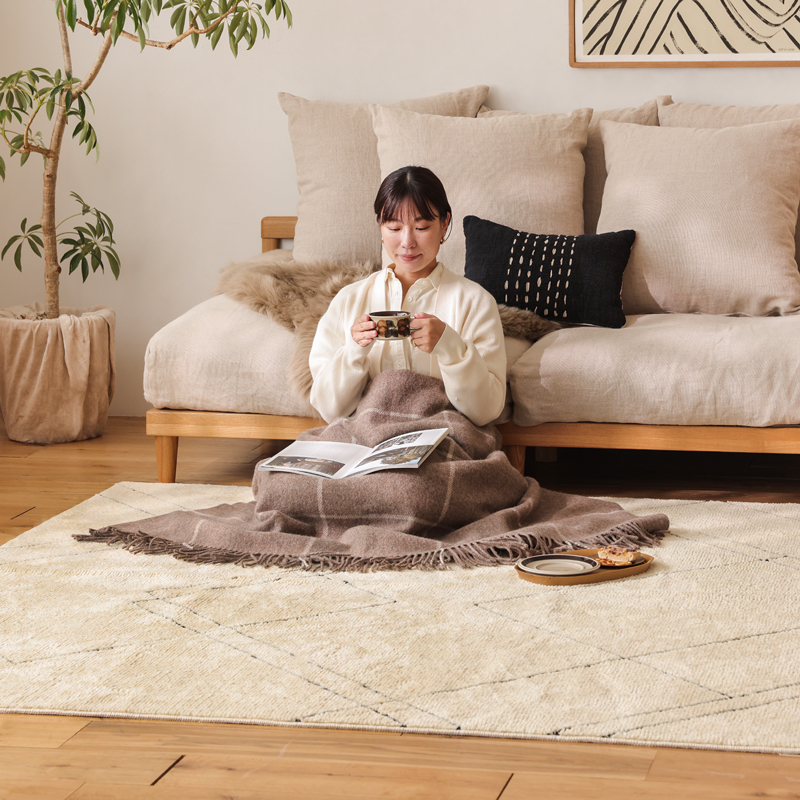 こちらのサイズなら、一般的な4人掛けのダイニングセットがまるっと収まります。ダイニングラグとしてお迎えいただく場合、「テーブルサイズ+60~70cm」を目安に、サイズをご検討いただければと思います。