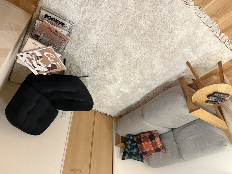 リビングのラグは、「ソファーの横幅より少し大きめサイズ」がおすすめ。安定感が生まれ、落ち着きのある空間を作れます。