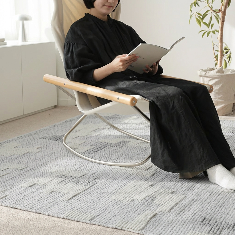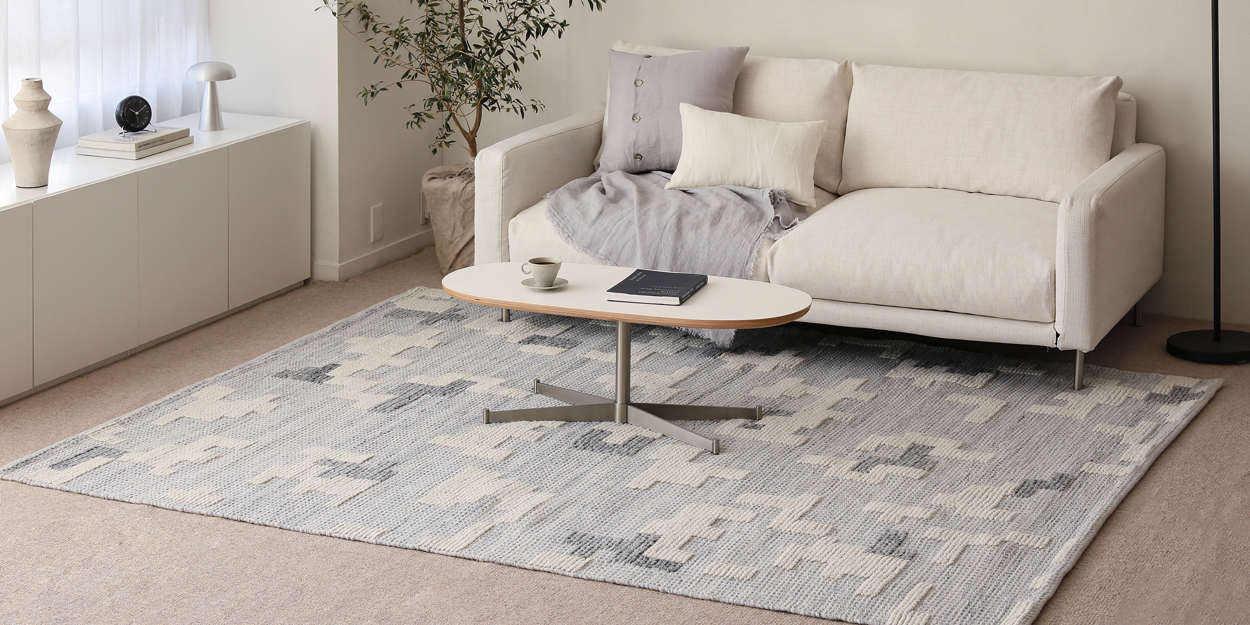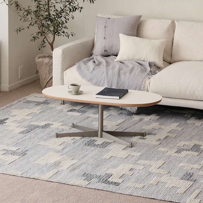青みを帯びたグレーは、フローリングと白い家具をやさしくつなぐ存在に。すっと溶け込みながら、お部屋を上質にまとめてくれます。