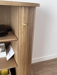 (また、設置してしばらくして扉中央下部に隙間が生じ、左右の木部が手前に反って段差が目立つ状態になりました。見た目が気になりますが、これは乾燥によるものとのことです。)