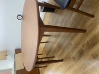 伸長式のテーブルで、我が家は基本は円形で使うことが多いため、真ん中の天板が収納できないことが最初懸念事項でしたが、実際使いはじててみると天板は冷蔵庫と壁の隙間に収納しておけば日常でも困らないし、楕円にした時に真ん中の天板が一枚板である方が木目が美しい!と思いました。テーブル内に収納できるタイプだと、どうしてもテーブル表面全体に繋ぎ目が多数見えてしまうので…