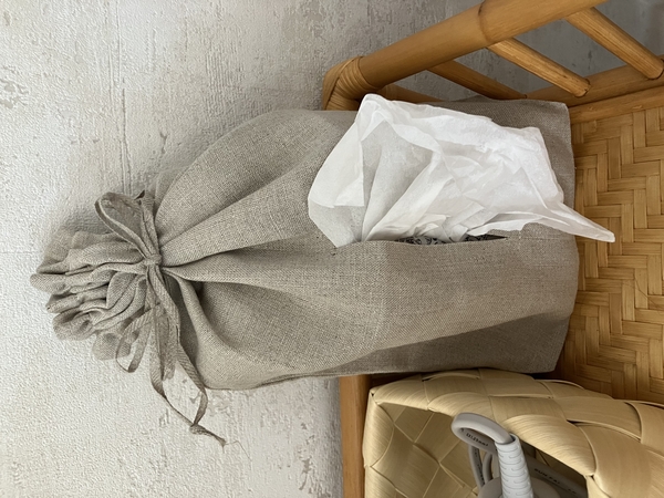 椅子に吊り下げて使っています。今後、洗濯等で生地がくたっと柔らかくなってくるのも楽しみたいと思います。