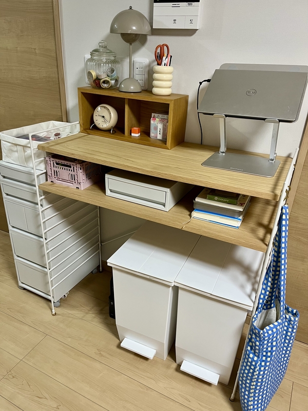 ゴミ箱を置く場所の上の部分がもったいないので、台を置き、保育園のお便り帳を書いたり、