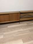 ガラス戸で囲まれたお家です。なので収納はガラス戸の前になるので、このシリーズの90cmくらいの高さの引き出し付きのシェルフを頼みました。シェルフは向こうも見えて、線が細いので圧迫感がなくとてもしっくり来ています。ただ、木のボードの脇のラミネートが2つほどすぐに剥がれてしまい、ちょっと残念。でも自分でボンドでつけたので問題はないです。