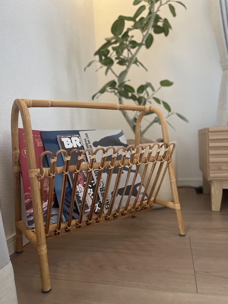 「ラタン(籐)」という天然素材の特性を活かした「マガジンラック JUGLAS (ユグラ)」。塗装はしておらず、ラタン本来が持つ色味や自然にできたムラをそのまま活かすことで、個性豊かな表情となっています。