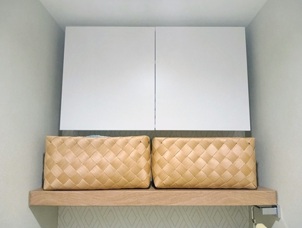 やはり想定どおり大きなキャビネットではあるのですが、奥行きが抑えられており、それほど圧迫感はなく必要なものはきちんと収納できます。