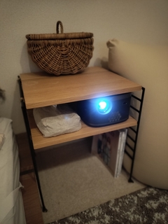 2段目は生活感が出てしまっていたプロジェクターとティッシュを死角収納して、一番下はゴミ箱を置いて使っています。