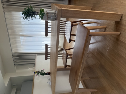 念願のダイニングテーブルと椅子、狭い場所に置くと狭く感じるかと思ったのですが、意外と座ると広く感じて、ゆったりできるのが不思議。