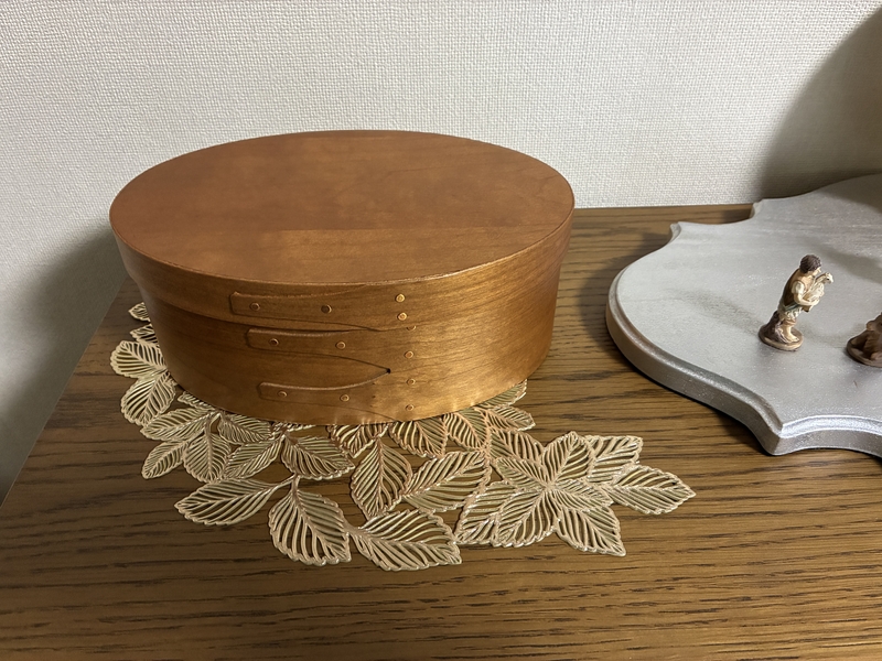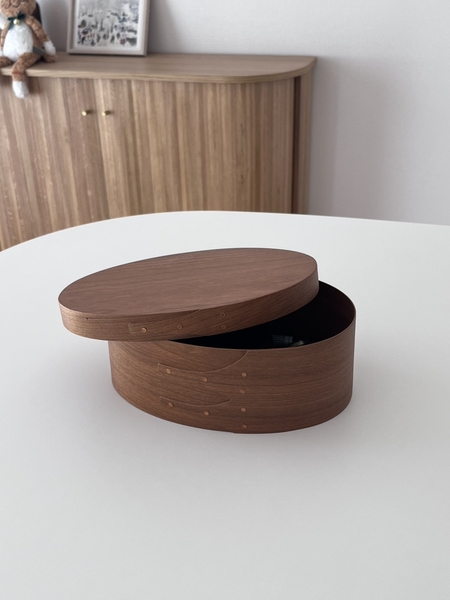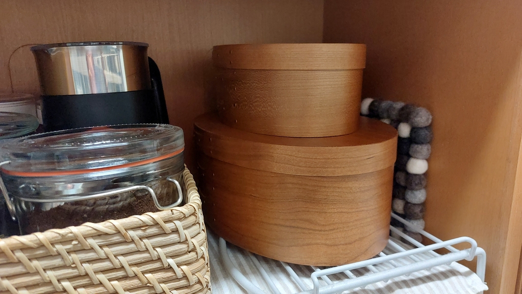 シェーカーボックスは、曲げ木の滑らかな曲線の美しさと、木製ならではの温かみを感じるデザイン。側面の木材を留めるツバメの尾のような仕立てと、真鍮のリベットからは、手作業の跡のような素朴な雰囲気を感じます。