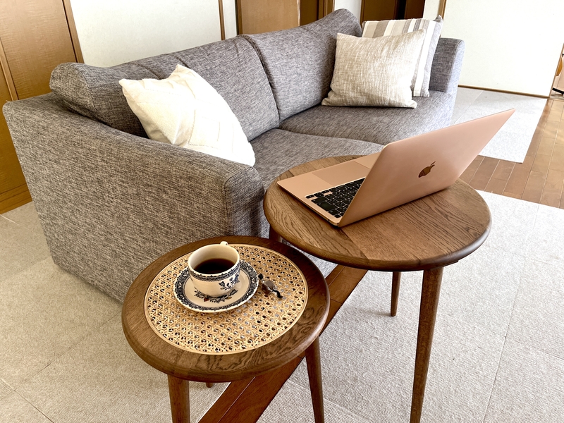 大小異なるサイズのテーブルを組み合わせた「RattanMix Nest Table」。ソファーでの食事やPC作業の時間を、より快適にしてくれます。