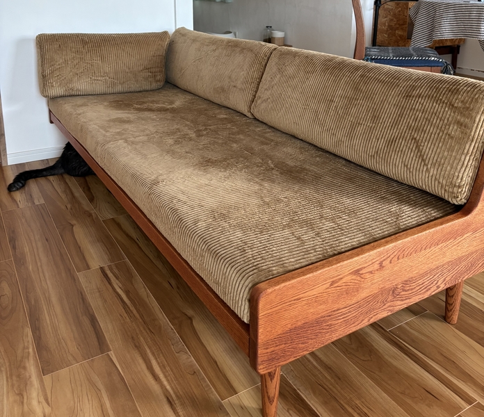 北欧ヴィンテージ家具のリペア時の生地張り直しに使用されるグレーストライプ生地は、実はデンマーク産のものが使われていることが多く、通常の生地の10倍くらいするとても高価な生地だったりします。