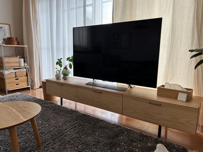 このテレビボードにより存在感を縮小することで、お部屋のコーディネートの完成度も上がることを期待しています。