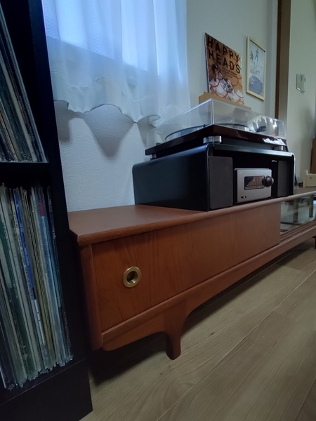 デッキ、パソコン、リモコン類をすっきり収納でき、上には小型のTVとレコードプレーヤーを置いています。
