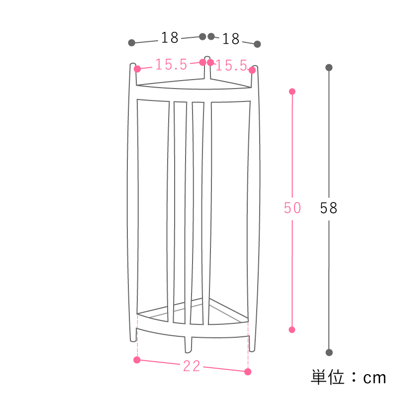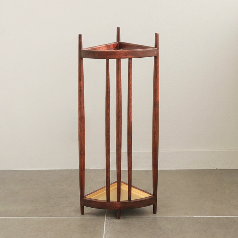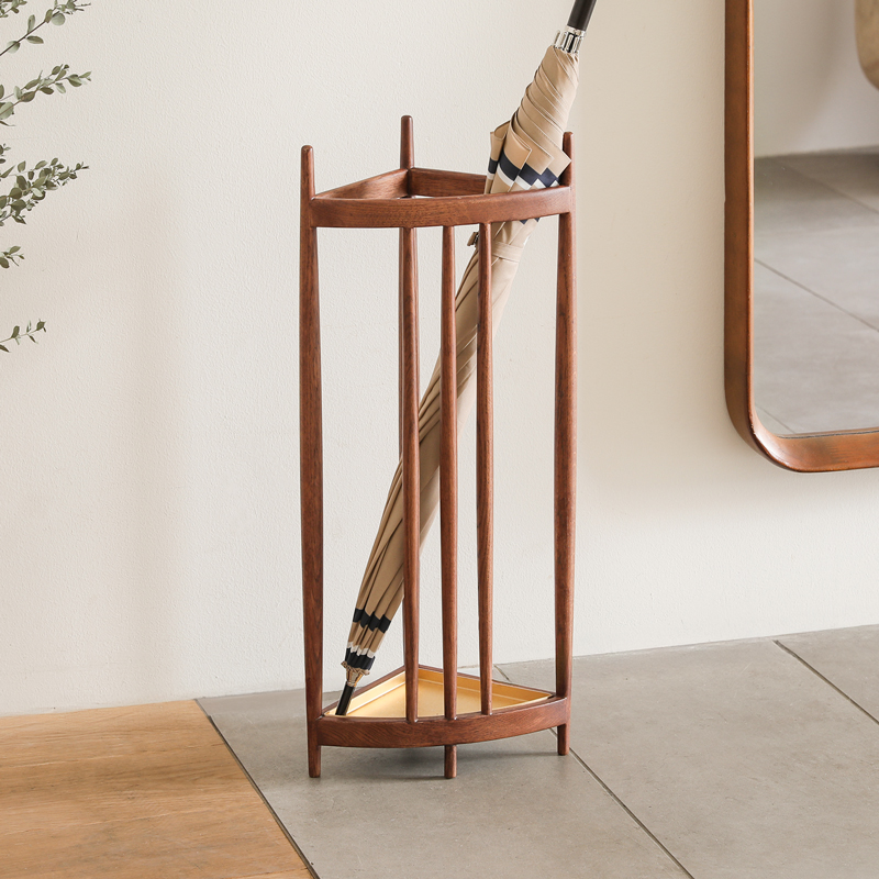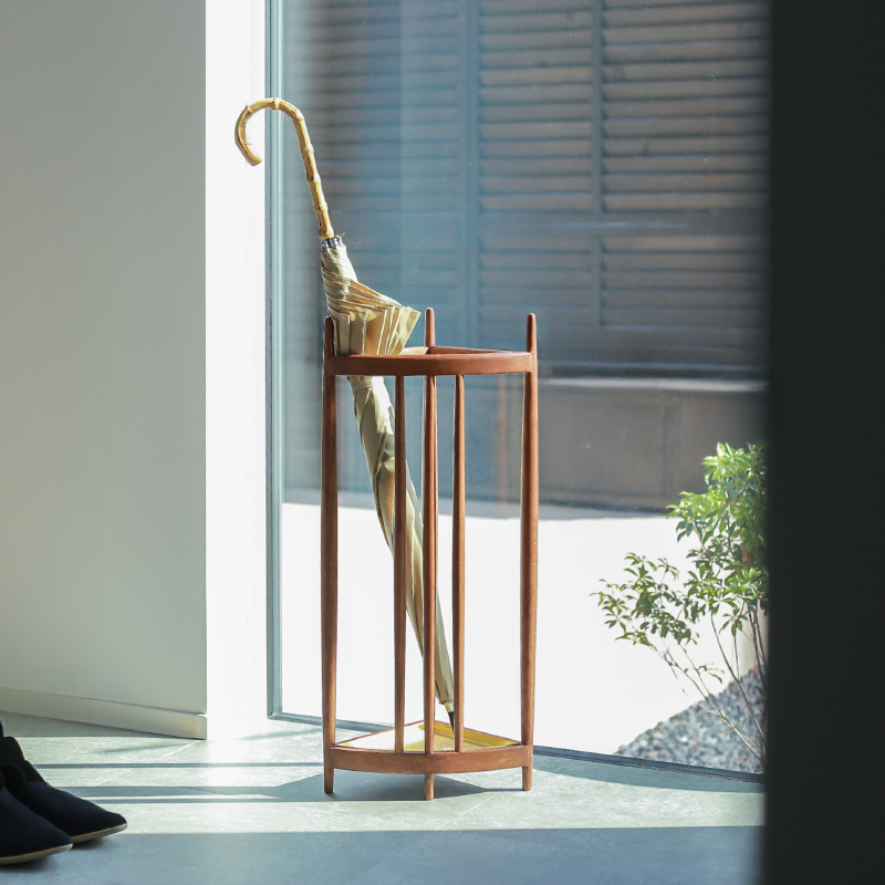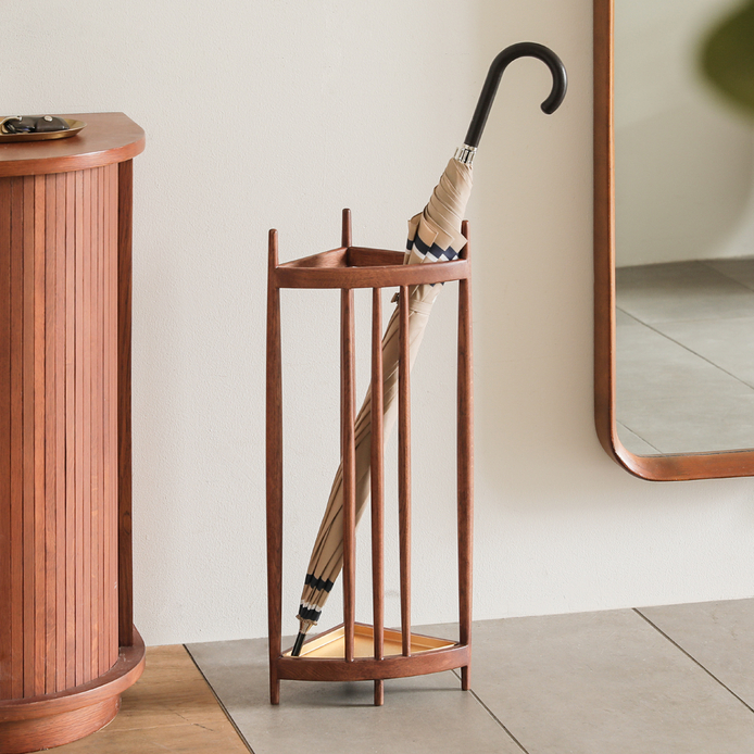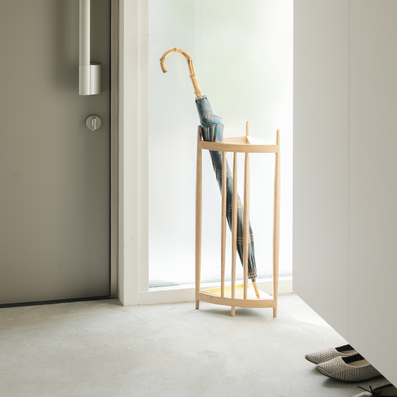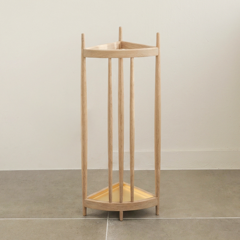 三角形の軽やかな木枠に傘を「飾るように置く」ことで、この傘立ては完成します。