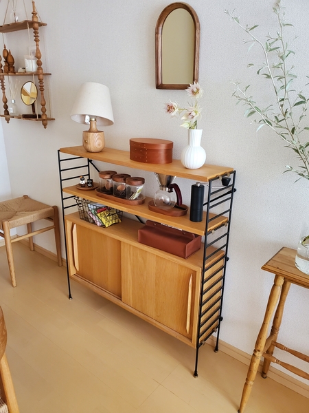 開き戸タイプで収納量が多いラタンキャビネット。 棚板で仕切れるので、食器や食料品のストックなど、細かく仕分けて収納するのに便利です。 床置きができるので、単体で使えるというのもポイント。ラタンを使った意匠も魅力的です。