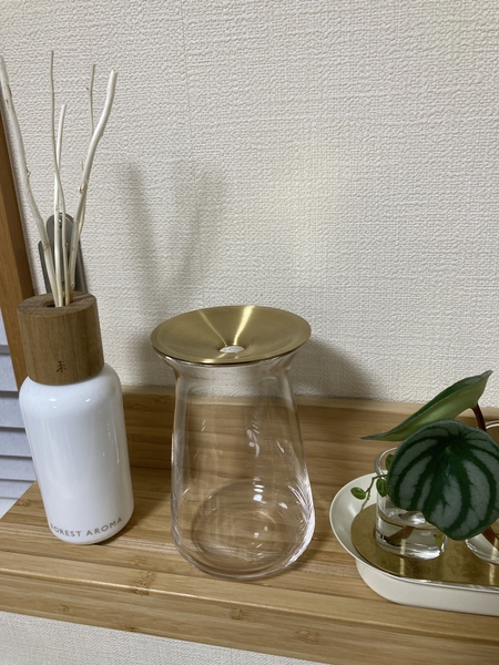 ベース部分はガラス製なので、上品な印象を保ちつつ、経年変化が楽しめるという、絶妙な素材の組み合わせで癒しのある空間を演出してくれます。
