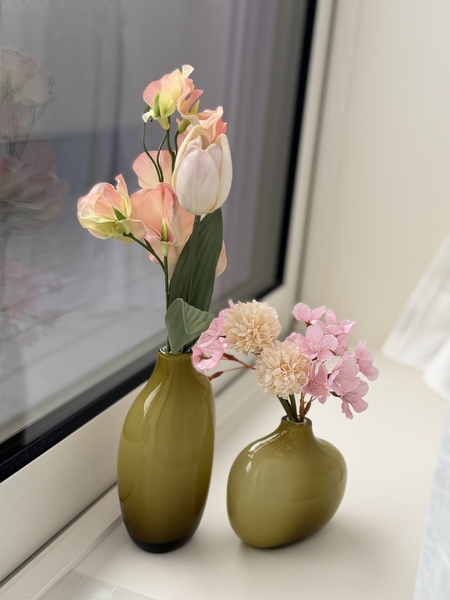 口が細いので、ボリュームのあるブーケなどを生けるのには向いていません。ですが、茎の細いお花であれば数本生けると、程よくまとまってバランスよく仕上がります。