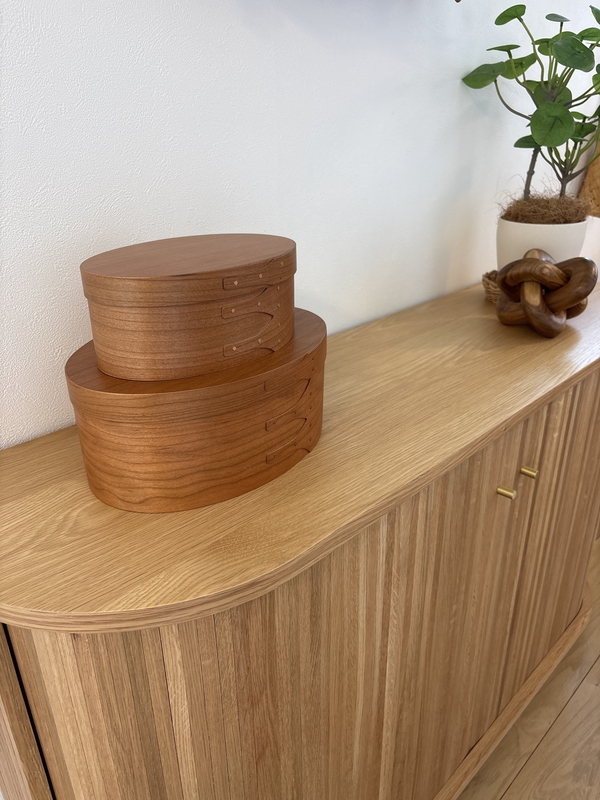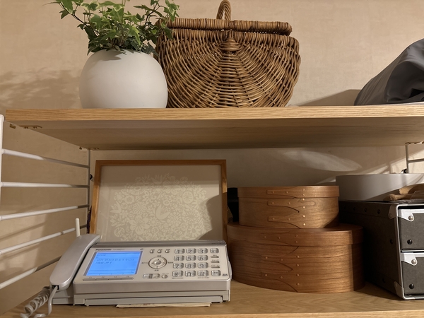 カゴ収納ばかりだと少し単調になりがちな空間に、このシェーカーボックスを置くだけで一気に雰囲気がおしゃれになりました。