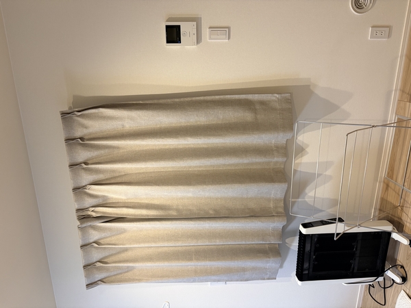 ひだが無くて、下の折り返しもないので見た目がとてもシンプルで素敵です。白い壁とも馴染んでいい感じです。